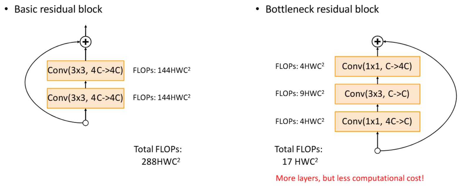 - ResNet-50 이후로는 계산양을 줄이기 위해 bottleneck residual block을 사용함
