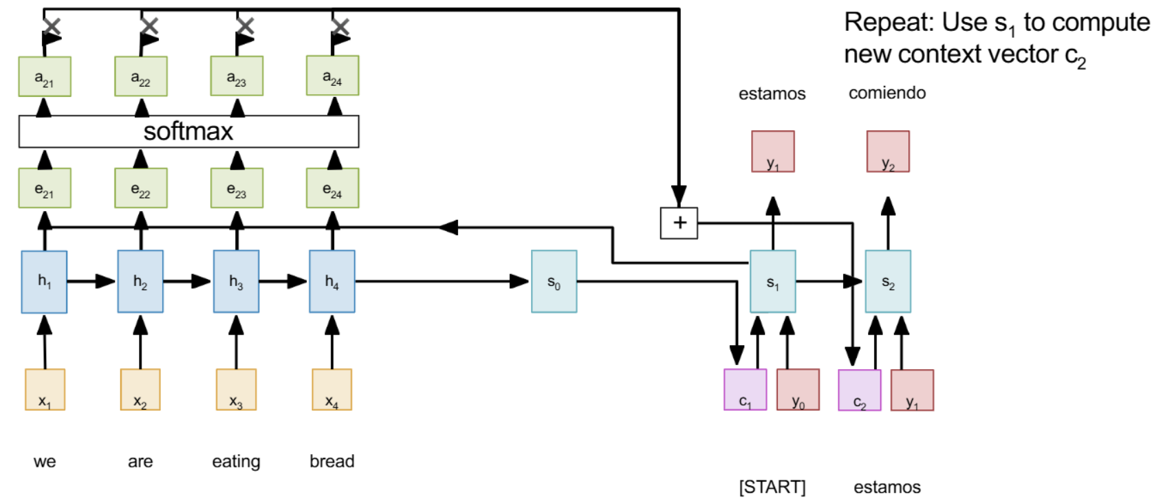 - 그렇게 만들어진 attention을 각 h와 곱해 다 더한 것이 context vector