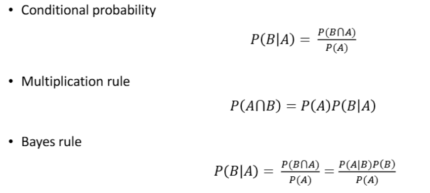 - Bayes rule : 결과 A가 관측되었을 때, B일 확률을 계산하는 공식으로, 결과를 바탕으로 원인에 대한 확률을 업데이트하는 방법