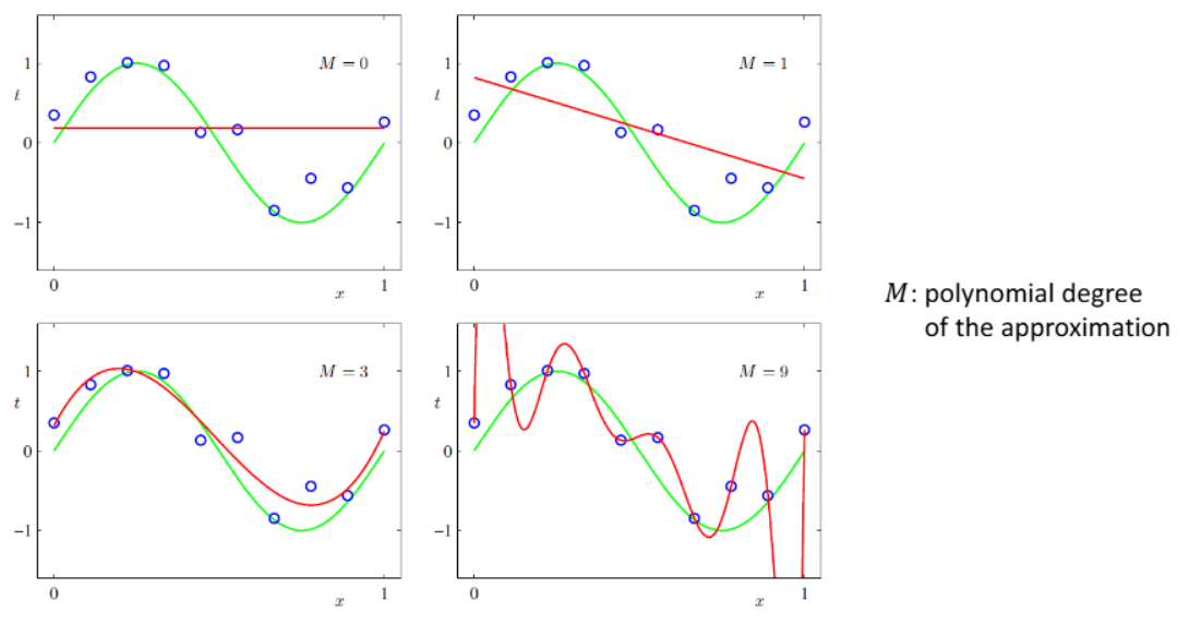 - 우리는 녹색 곡선을 모르지만, 그걸 근사하는 모델을 학습해서 새로운 x에 대해 t를 예측하고 싶음