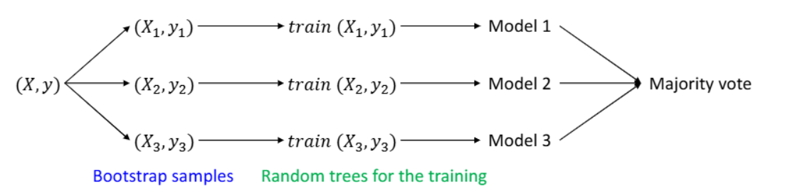 - 원본 데이터셋 (X, y)로부터 여러 개의 부트스트랩 샘플을 생성