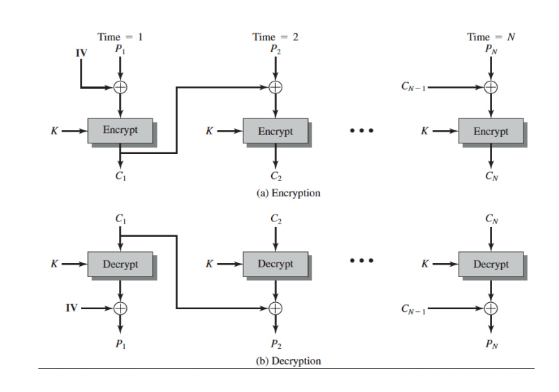 - 복호화는 Dec(C1, K) ⊕ IV 또는 Dec(Ci, K) ⊕ Ci-1