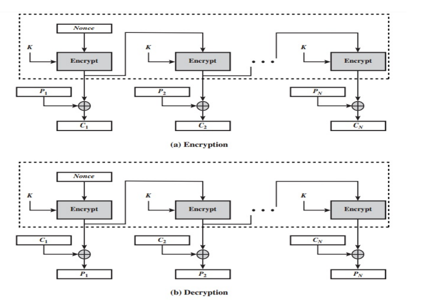 - 복호화는 P1 = Enc(K, IV) ⊕ C1 또는 Pi = Enc(K, Ci-1) ⊕ Ci