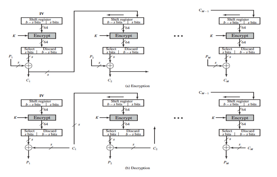- 이 s비트를 평문 블록과 XOR하여 암호문 블록을 만듬